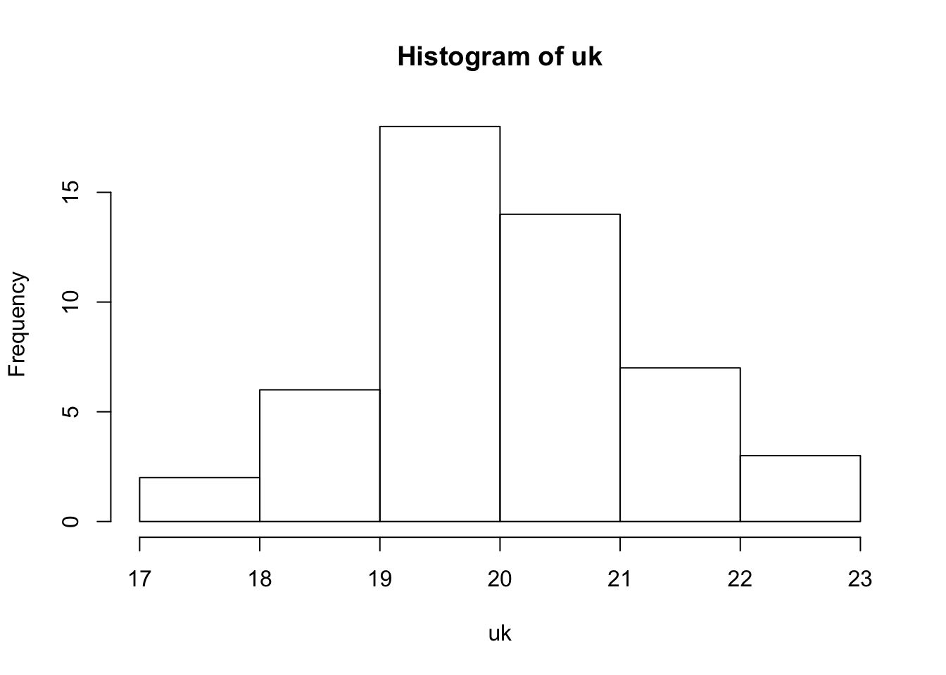 uk <- rnorm(50,mean=20,sd=1)
