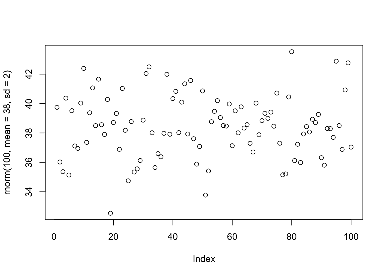 plot(rnorm(100,mean=38,sd=2))