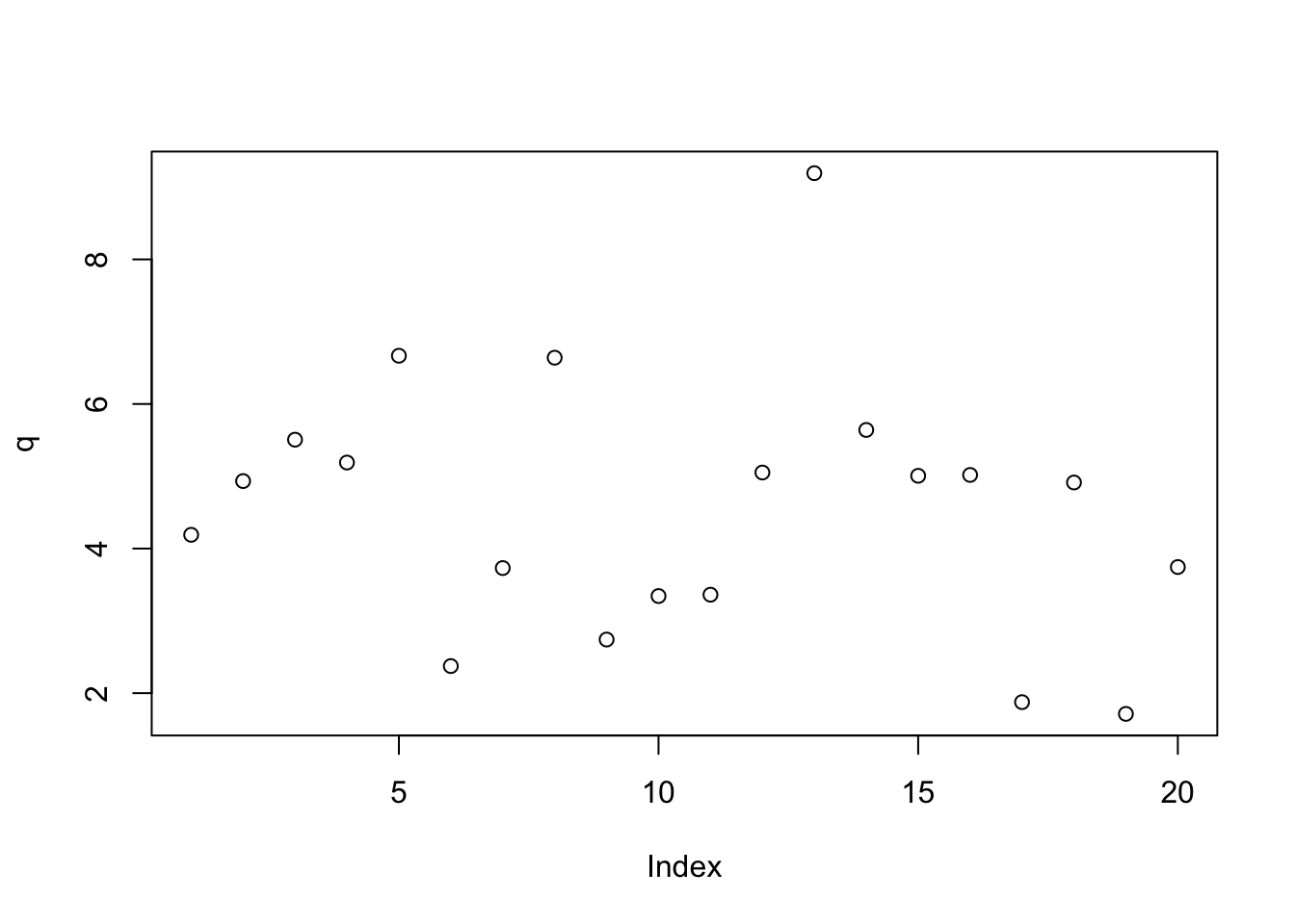 q<- rnorm(20, mean = 5, sd = 2)