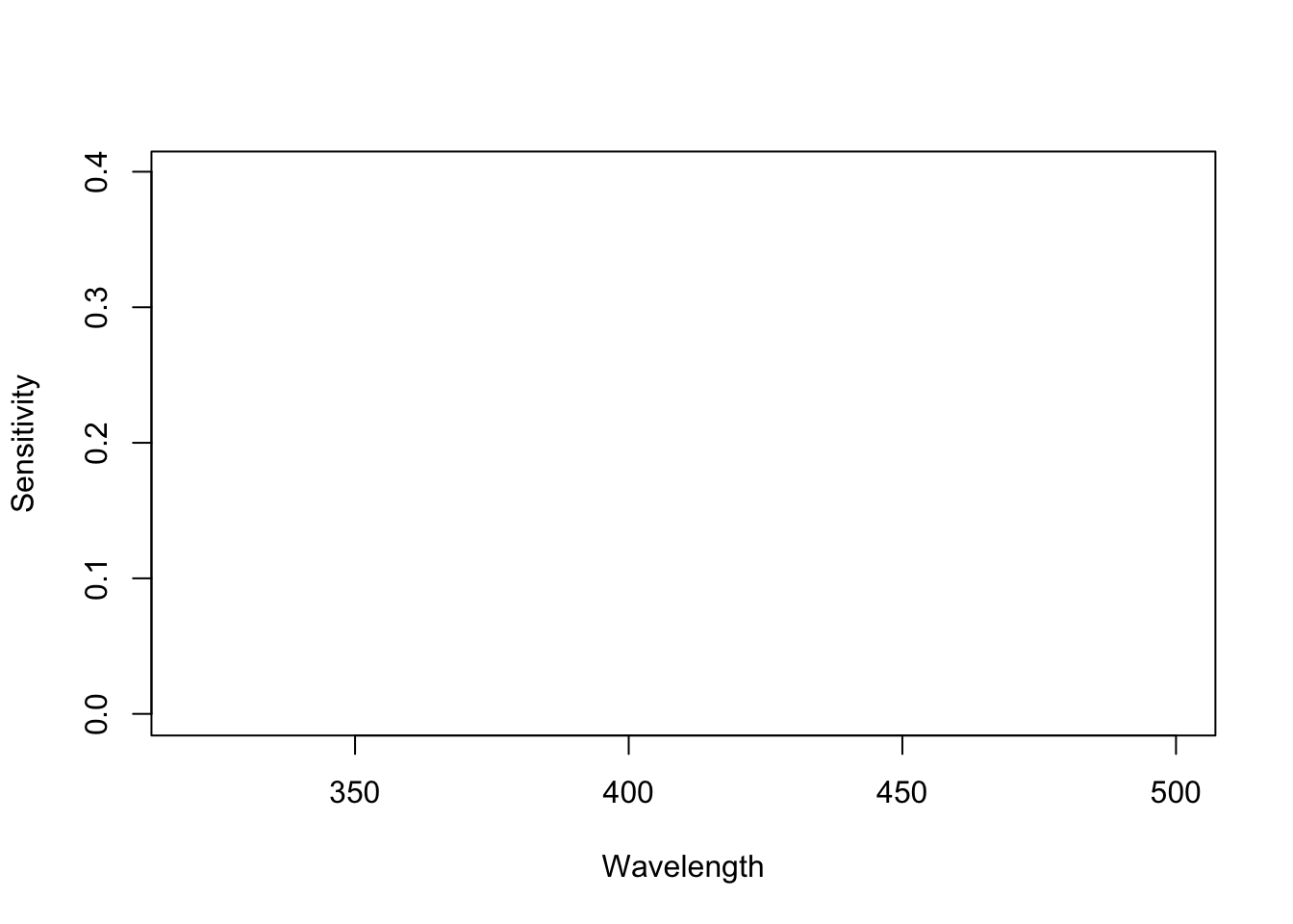 plot(Slen,Sx,type="n", xlab ="Wavelength", ylab = "Sensitivity", axes = TRUE)